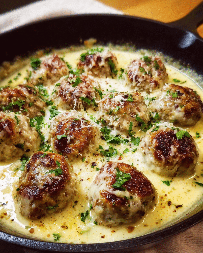 A rich and comforting casserole made with tender meatballs, creamy garlic parmesan sauce, and melted cheese.