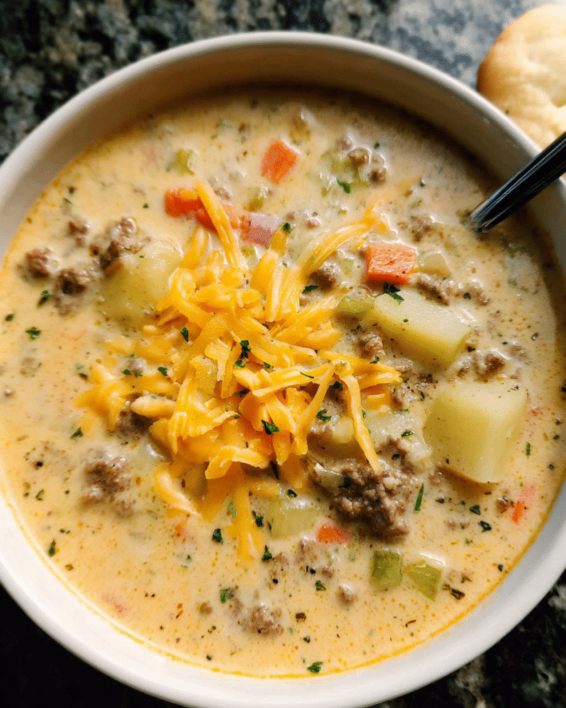 A creamy and hearty beef cheeseburger soup made with lean ground beef, cheddar cheese, tender potatoes, and fresh vegetables. Perfect for cozy nights and full of comforting flavor.