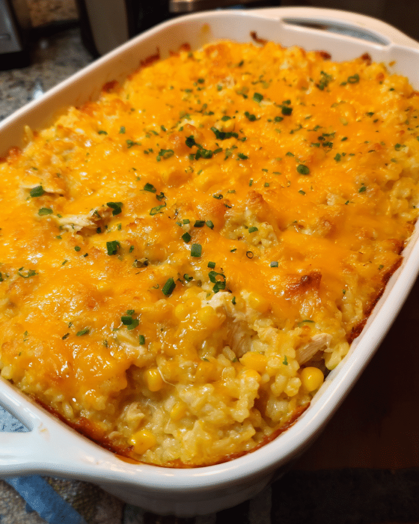 A comforting baked casserole with tender chicken, sweet corn, seasoned rice, and melted cheddar cheese.