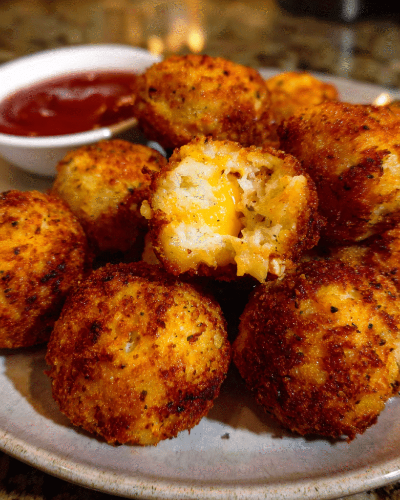 There is something deeply satisfying about biting through a crunchy coating and discovering a soft, savory filling inside. These stuffed bites combine fluffy potatoes with seasoned chicken, creating a rich interior that feels hearty without being heavy. The cheddar melts into the mixture, forming a creamy core that makes each bite memorable.