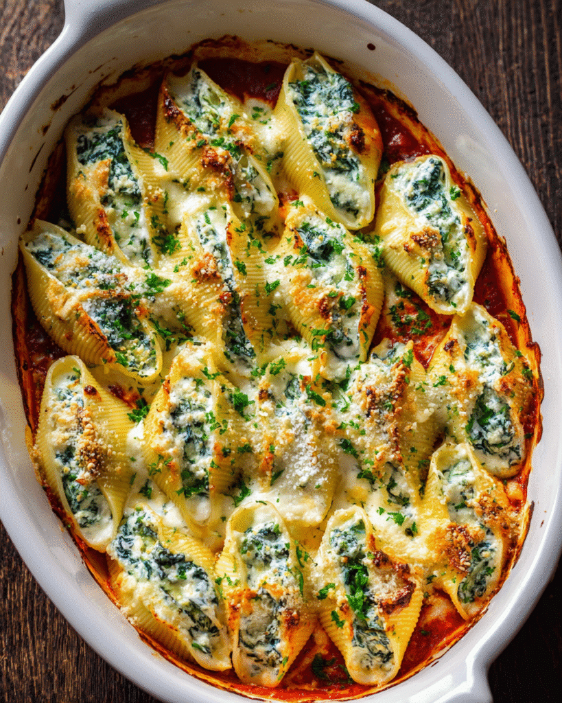 Cheesy stuffed pasta shells filled with ricotta, spinach, and herbs, baked in marinara for a comforting meal.
