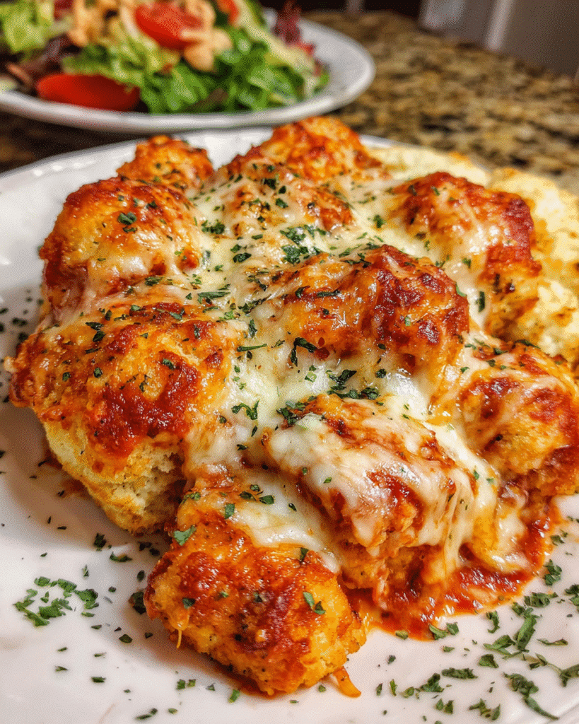 Unlike traditional chicken Parmesan, which requires dredging, frying, and layering, this version simplifies the process while preserving its signature flavor. The biscuits expand as they bake, creating soft, pillowy pockets that soak up marinara and melted cheese. Each serving feels hearty without being complicated.