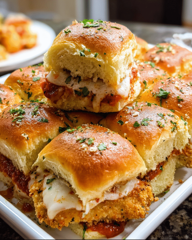 Chicken Parmesan Sliders layered with crispy chicken, marinara sauce, and melted mozzarella baked inside buttery garlic rolls.