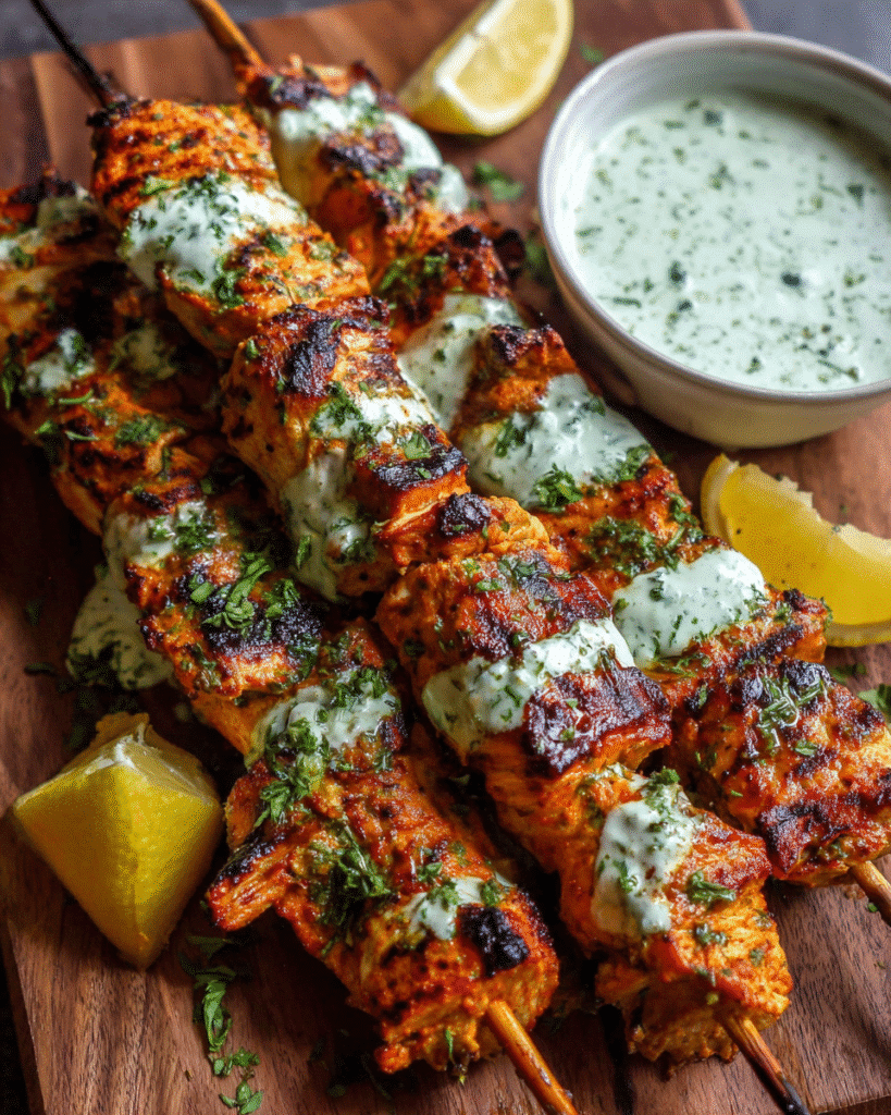 Juicy grilled chicken skewers marinated in yogurt, tomato paste, and warm spices, served with a fresh cilantro lime yogurt sauce. A flavorful Indian-inspired appetizer or high-protein meal.