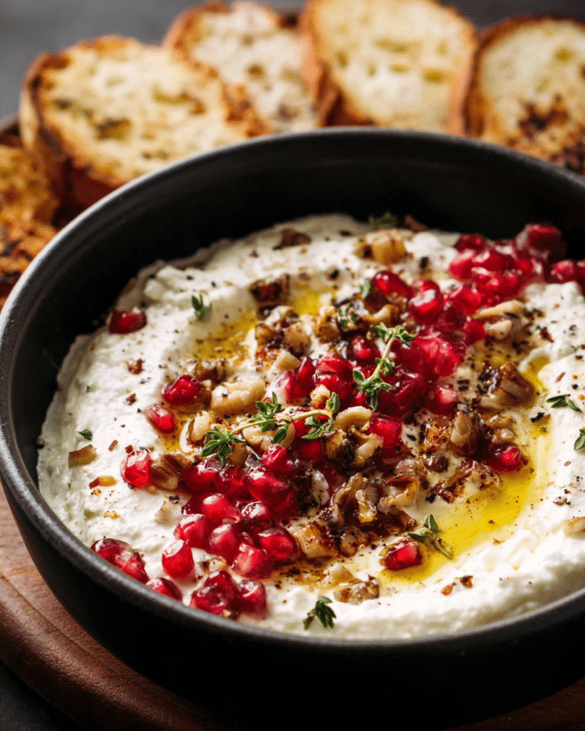 A festive whipped feta dip blended with honey and garlic, then topped with pomegranate seeds, candied nuts, fresh thyme, and citrus zest. Perfect for holiday gatherings.
