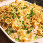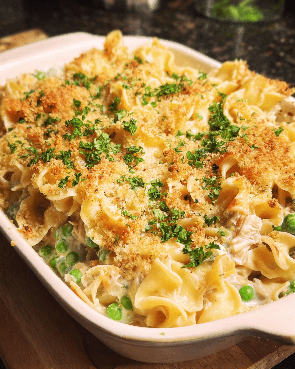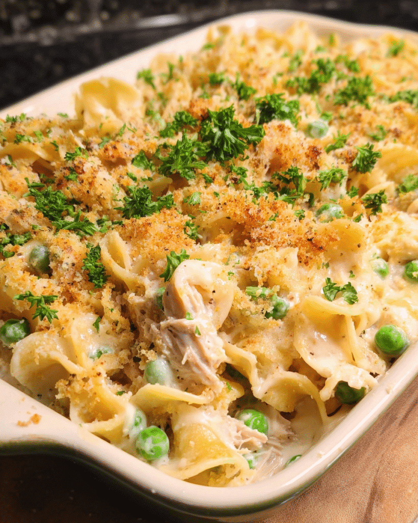 A creamy and comforting tuna noodle casserole with a golden crispy topping, perfect for easy family dinners.