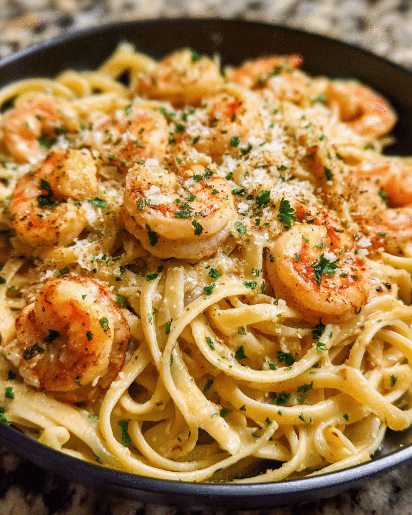 A quick and rich pasta dish with shrimp, garlic, and a creamy Parmesan sauce.