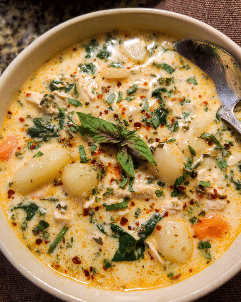 A rich and hearty creamy gnocchi chicken soup made with sun-dried tomatoes, spinach, and Parmesan in a velvety herb-seasoned broth. A cozy one-pot meal perfect for chilly nights.