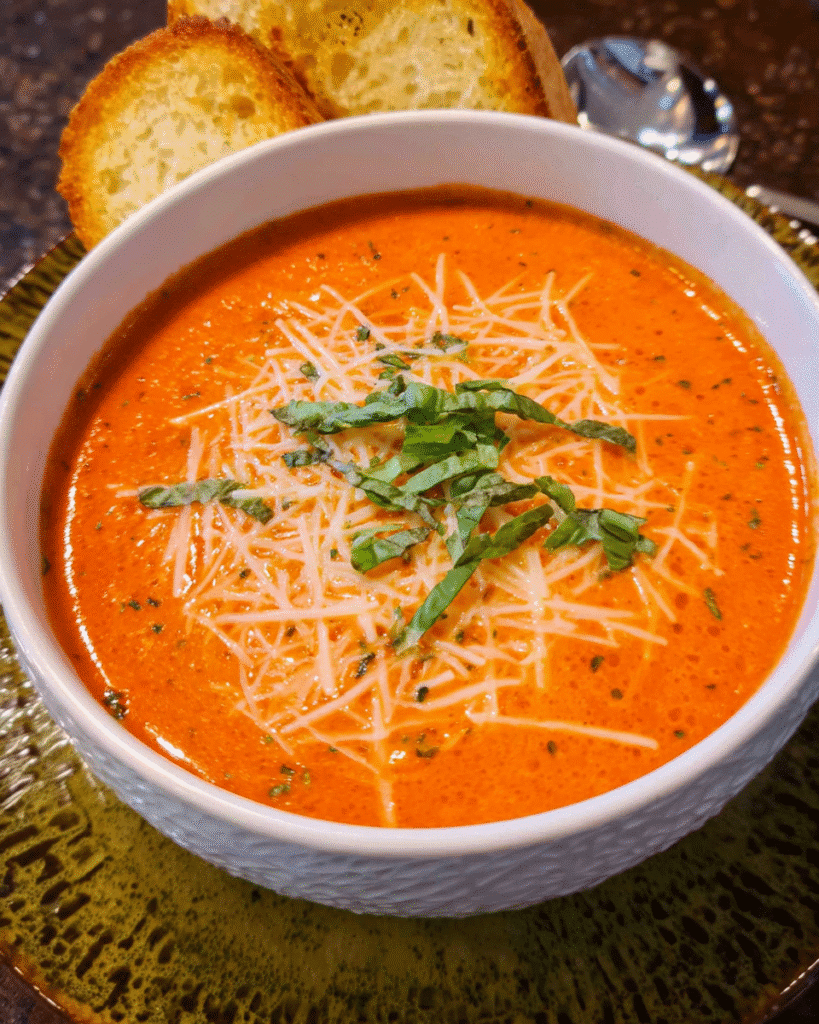 A rich and velvety tomato soup made with butter, fresh basil, cream, and Parmesan cheese for the ultimate comforting bowl.