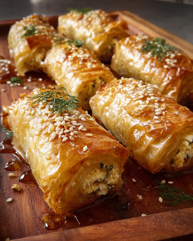 Crispy baked feta rolls wrapped in buttery phyllo dough with garlic, lemon zest, and fresh dill. Served warm with hot honey for a sweet and savory Mediterranean appetizer.