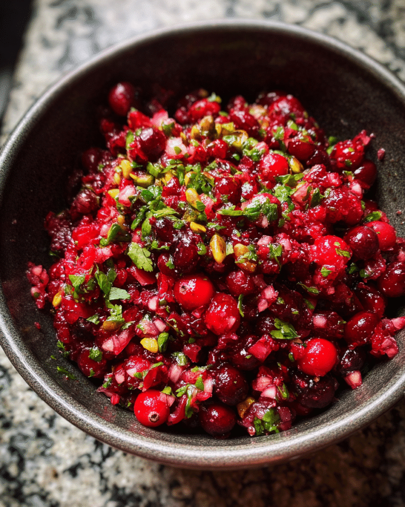 Most cranberry dishes lean heavily into sweetness, but this recipe takes a different direction. The tartness of fresh cranberries stays at the forefront, supported by bright herbs and zesty citrus. The result feels crisp, bold, and refreshing rather than overly sugary.