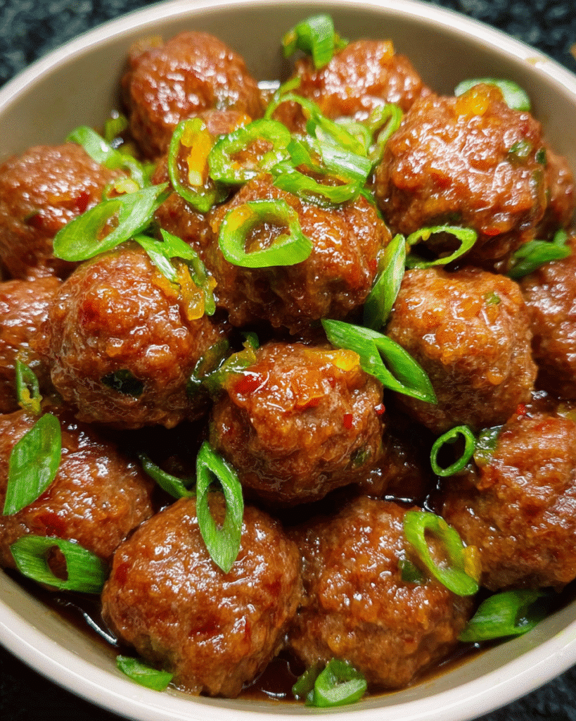 Once the meatballs are hot, they’re transferred to a serving dish and coated with the sauce. A gentle stir ensures every piece is evenly covered. The final sprinkle of green onions adds freshness and a pop of color, making the dish feel complete and ready to serve.