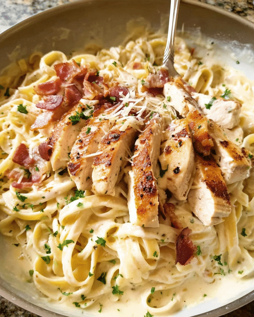 A rich, satisfying pasta dish made in just 20 minutes with juicy chicken breast, smoky turkey bacon, and a creamy Parmesan sauce. This quick creamy chicken bacon pasta is perfect for busy weeknights when you need something fast, comforting, and deeply flavorful.