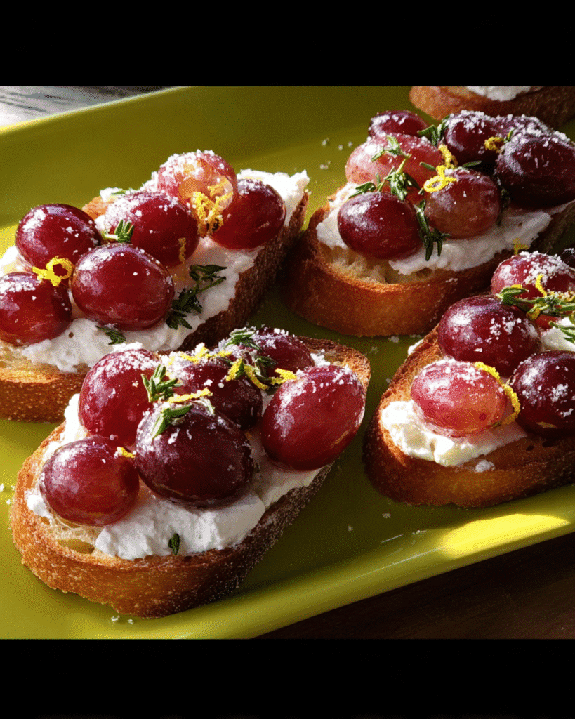 Finish with lemon zest and a pinch of flaky salt. The crostini are best served immediately while the bread remains crisp and the grapes retain their warmth.