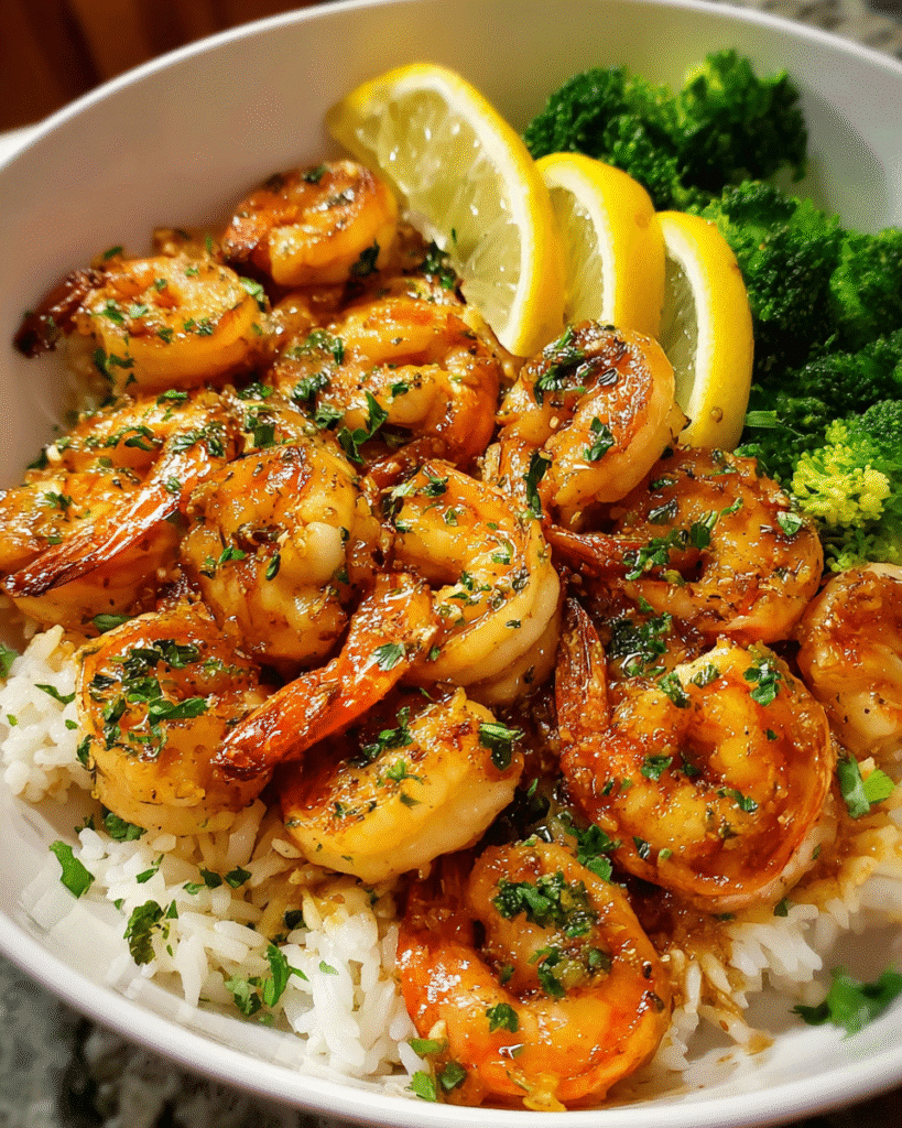 The glossy honey-garlic glaze highlights the natural sweetness of shrimp while lemon and herbs keep everything fresh. Served with rice and vegetables, the result is a balanced meal that comes together in minutes.